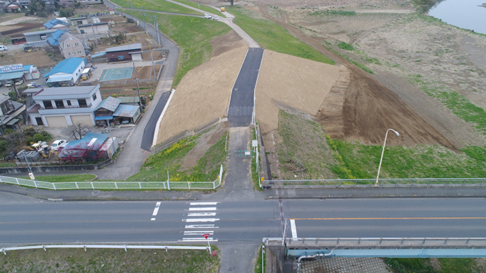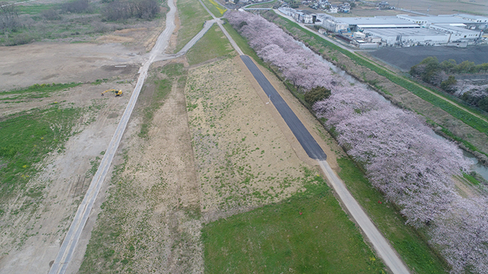【河川土工】 掘削工(ICT):124,800m3 路体(築堤)盛土(ICT):9,800m3 法面整形工(ICT):20,000m2 植栽工:1式 伐木除根工:1式 【法覆護岸工】 コンクリートブロック工(コンクリートブロック積):1式 植生工:1式 【付帯道路工】 路側防護柵工:1式 アスファルト舗装工:1式 縁石工:1式 【付帯道路施設工】 道路付属物工:1式 標識工:1式 【光ケーブル配管工】 作業土工:1式 配管工:1式 ハンドホール工:1式 付属物工:1式 【構造物撤去工】 防護柵撤去工:1式 標識撤去工:1式 土のう撤去工:1式 構造物取壊し工:1式 運搬処理工:1式 【仮設工】:1式